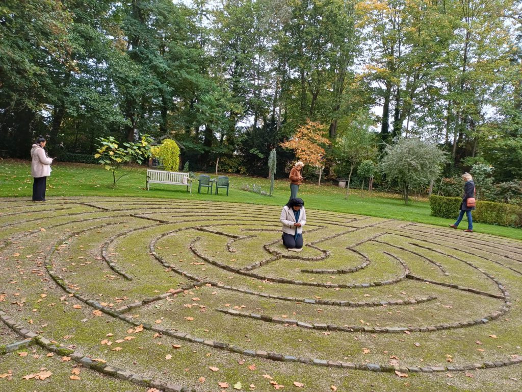 Dicht bij ons in de buurt staat een klooster met een labyrint van Chartres in de kloostertuin. Het voelde bijna vanzelfsprekend om dit samen te willen lopen, net als in het boek. Een wandeling die geen haast kent, maar aandacht vraagt. Terwijl je naar het centrum loopt, mag je opmerken wat je belemmert, waar je angsten zich verschuilen en waar je liefde naartoe stroomt. Je mag jezelf de vraag stellen of dat in harmonie is met je vriendschap met God.